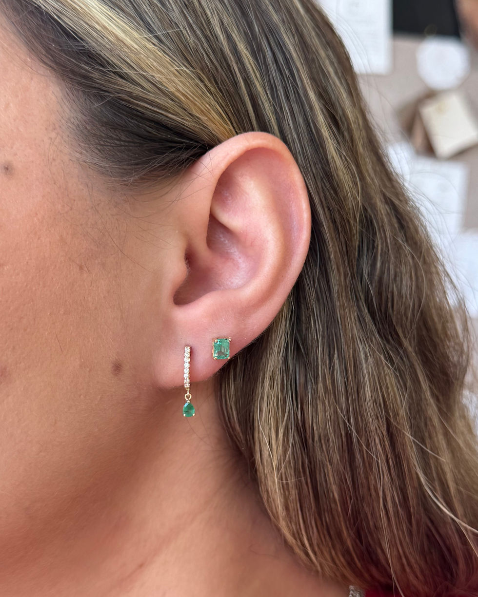 Par de arracadas en oro amarillo 14k, diamantes naturales (0.13ct) y gemas naturales en corte pera: Esmeralda (verde), Rubí (rojo) y Zafiro (azul). PIEZAS ÚNICAS.
